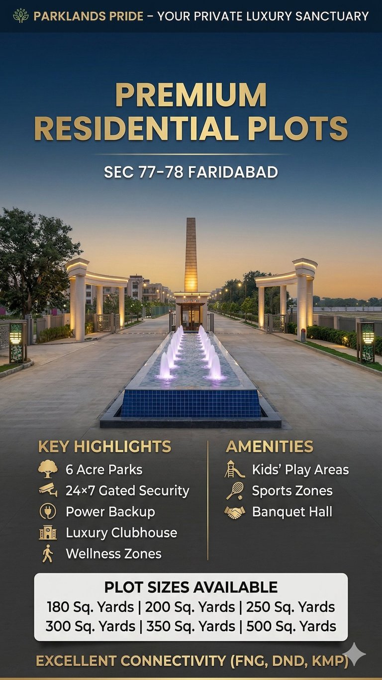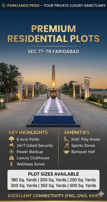 Parklands Pride is a premium gated plotted community in Sector 77-78, Faridabad. Surrounded by lush greenery and designed with modern infrastructure, it offers an ideal mix of peaceful living, strong connectivity, and long-term investment potential