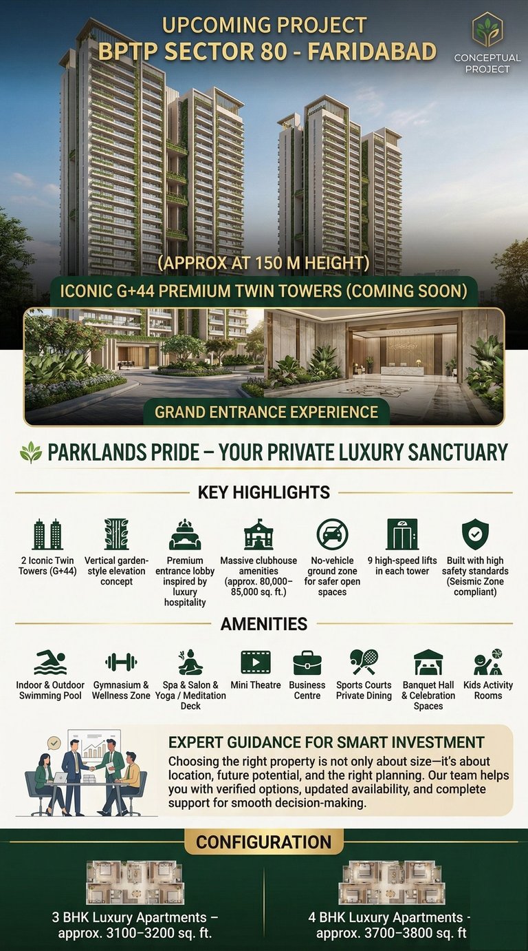 BPTP Sector 80 Faridabad is an upcoming premium residential development featuring two iconic high-rise towers (G+44) with a height of approximately 150 meters. The project is designed for modern luxury living with elegant architecture, vertical green elements, and a grand entrance experience.